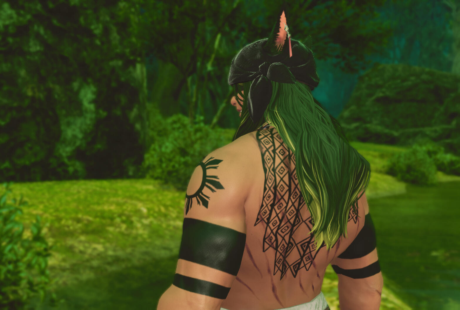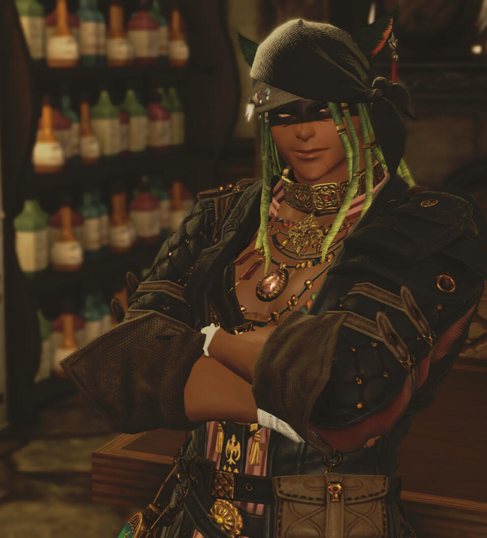 Toadie is built big, boasting a body built like a strongman. At 5'11 and just under 300 ponz, he is quite a monster of a miqo'te. His green hair, twisted into dreads, often has flowers of all colors along with rings and trinkets of varying types. His right eye, a bright gold, is a striking contrast to the more muted amber left eye.Tattoos cover his body in a growing mosaic that describes his own personal journeys and achievements. Twin suns sit on opposite shoulders and bands wrap around his arms and fingers, while a cascade of scales fall from the back of his neck. When completely shirtless, his days as a fighter are obvious as reminders of past close calls are visible. His back, especially, is littered with a crisscross of angry looking scars that give no illusion to his familiarity with a cat o' nine tails.His voice carries a permanent deep rumble that tangles his words when he speaks. An older man, his gaze has grown sharper but his smiles are still easy with clear crows feet at the corners of his eyes. A laugh still ready at a moment's notice, he has gained wisdom while losing none of his mischievous nature.