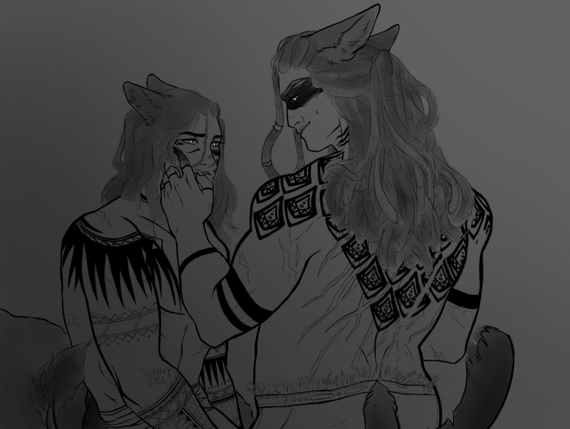 A sigwa beastmaster, he maintains a close bond with his clan’s Hhetso. Power that waits. When he strikes it is sudden, powerful, and deadly. There is a clear preference in intimidating his opponents with an unyielding grounded stance that can withstand even monk-like strength. Preferring close quarters with direct and devastating attacks, like the jaws of the croc, he only needs to catch you once.No longer the young man he once was, every strike shows a conservation of movement only earned through years of training. However, his methods have not changed as he throws himself into combat headlong without an ounce of restraint. His movements are more calculated to withstand his opponents strikes while he learns their cadence. Everything about his fighting style is to endure as he gets in close for that final strike. A fight with him is a war of attrition as he is built to take a beating and outlast, he waits for his opponent to exhaust themselves. The longer you spend in combat with him the greater the chance he will win.A martialist by profession, he wields either an axe or twin blades with the skill of a man who has forged himself in battle. However, grappling is his preferred form of combat, and it’s not uncommon for him to drop his weapons when up close to grab his opponent. Expert throws and pins are his bread and butter in close quarters with the strength to happily break bone when given the chance.In more stealthy situations he uses his gifts with the bow and can often hit his mark dead on from a sizable distance. A longbow with a draw weight that would stagger most, he banks more on a one shot kill than any lengthy battle. Though it should be said that fools thinking they might gain advantage by forcing him into melee will find a beast with bared talons more than happy to play... And that's just his zu.