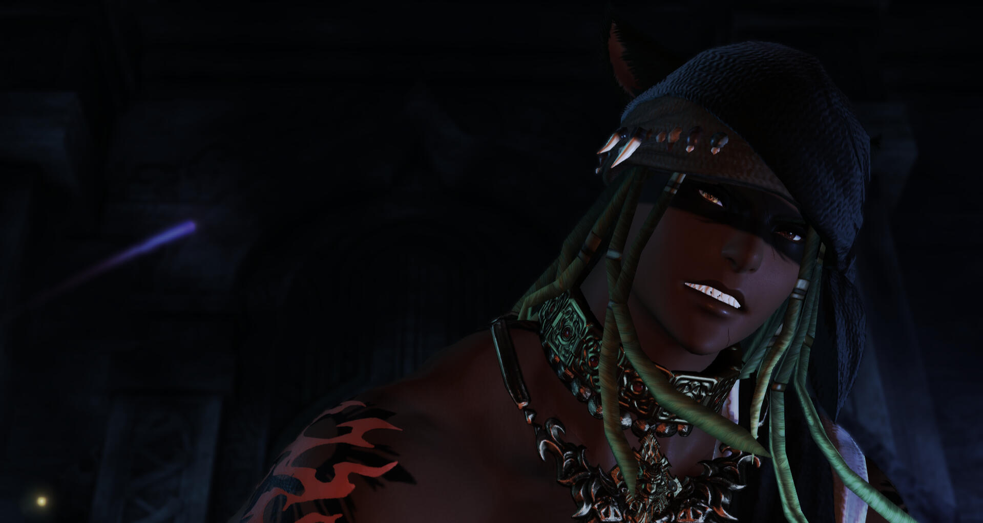 Toadie is built big, boasting a body built like a strongman. At 5'11 and just over 300 ponz, he is quite a monster of a miqo'te. His green hair, twisted into dreads, often has flowers of all colors along with rings and trinkets of varying types. His right eye, a bright gold, is a striking contrast to the more muted amber left eye.Tattoos cover his body in a growing mosaic that describes his own personal journeys and achievements. Twin suns sit on opposite shoulders and bands wrap around his arms and fingers, while a cascade of scales fall from the back of his neck. When completely shirtless, his days as a fighter are obvious as reminders of past close calls are visible. His back, especially, is littered with a crisscross of angry looking scars that give no illusion to his familiarity with a cat o' nine tails.His voice carries a permanent deep rumble that tangles his words when he speaks. An older man, his gaze has grown sharper but his smiles are still easy with clear crows feet at the corners of his eyes. A laugh still ready at a moment's notice, he has gained wisdom while losing none of his mischievous nature.
